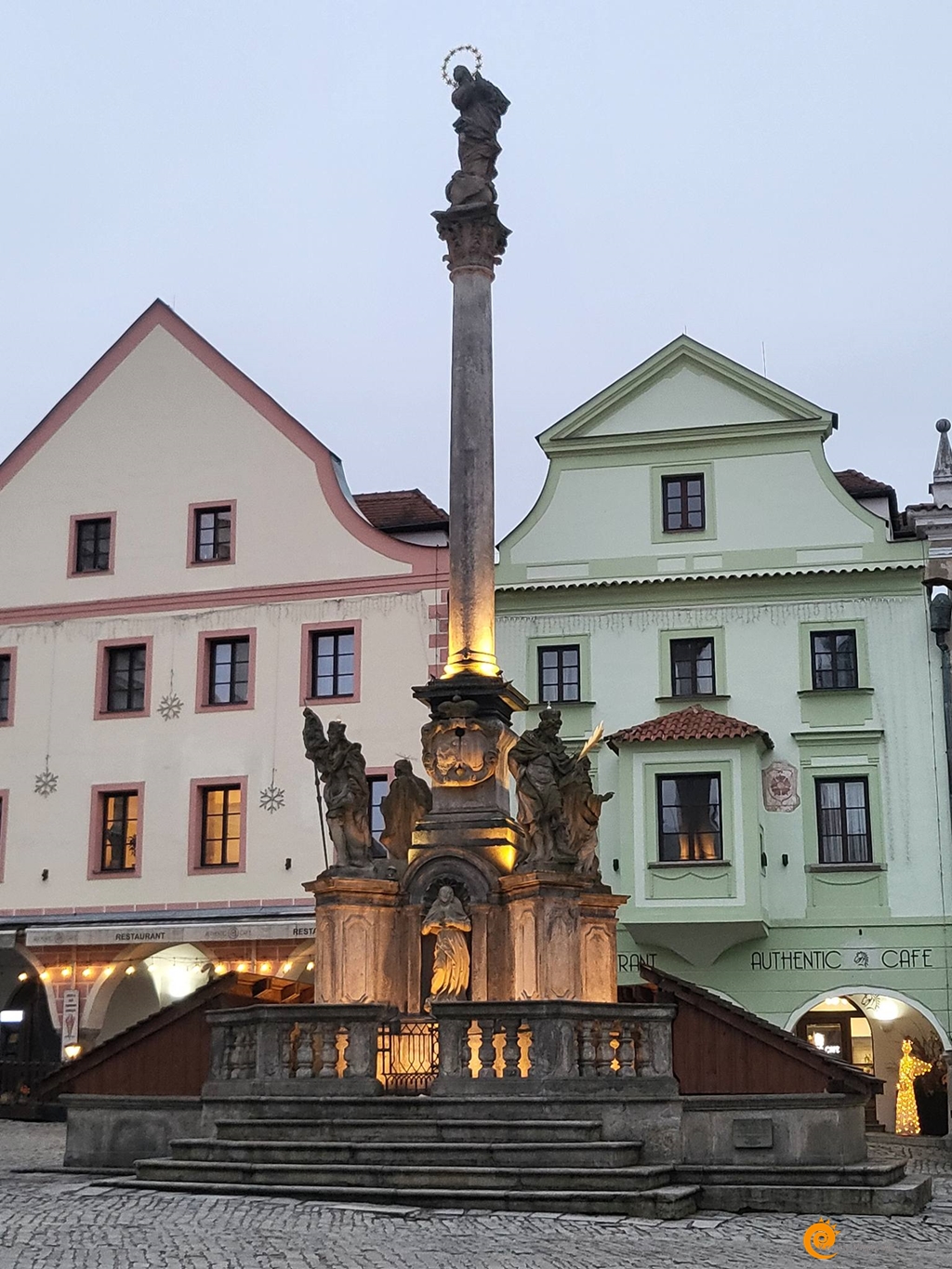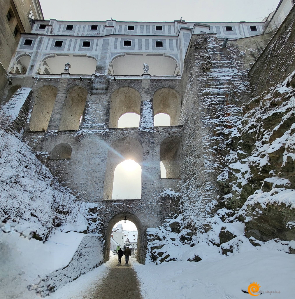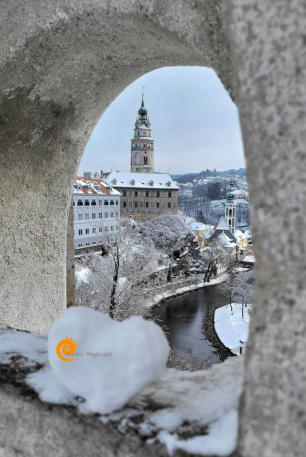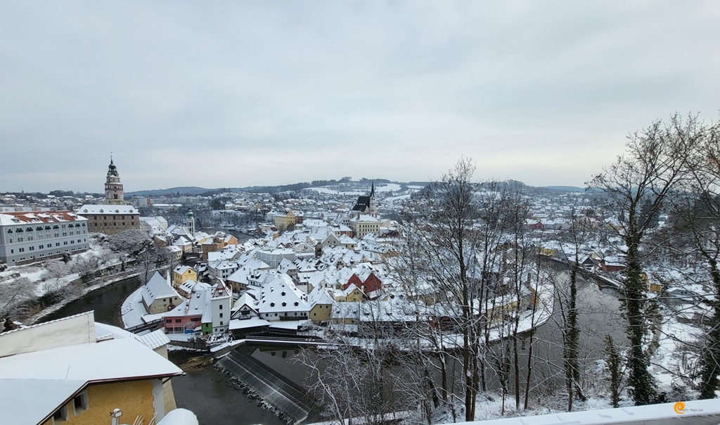 A várkert felé sétálva érdemes megállni a köpeny-hídnál, ahonnan a legszebb rálátás nyílik az óvárosra. Itt látszik igazán, hogy a Moldva hogyan öleli körbe a belső várost, mintha csak egy természetes védővonalat húzna a külvilág és ezen apró csoda közé. A fagyos folyóvíz sötét szalagként kanyarog a világos házfalak között, a távolban pedig a környező dombok erdőségei adják a keretet ehhez a festői kompozícióhoz. Ez a látvány az, amiért érdemes télen is útra kelni, hiszen a nyári zöld pompát felváltja egy sokkal tisztább, letisztultabb elegancia.